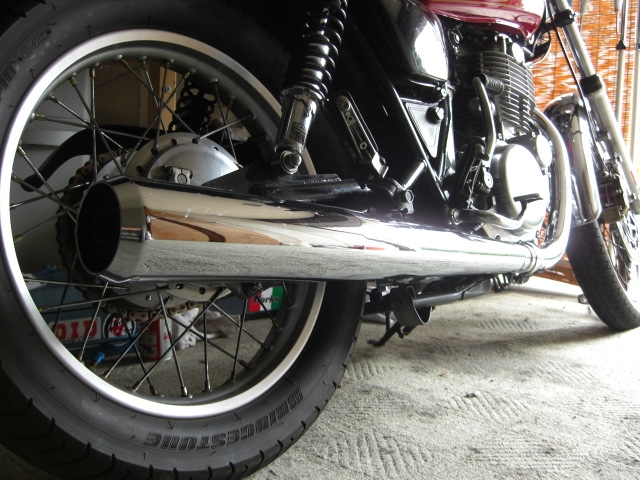 ノーマルマフラーを真横から見ると、若干後ろに向かって左上がりなのも