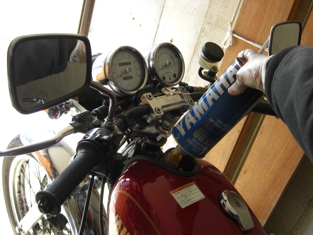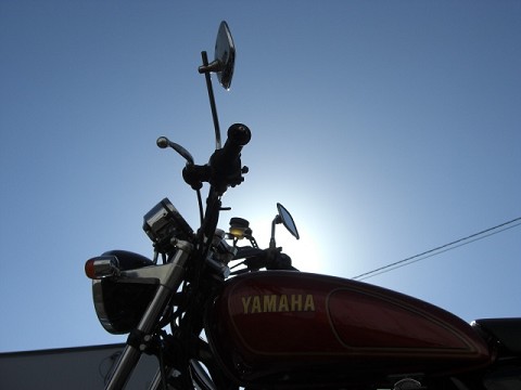 ハンドルやミラーの角度を調整し、各部絞め忘れがないか点検。組みあがった全体像を一歩離れて眺めると、お、いい感じ。70年代のYAMAHAのシルエットっぽくもある。全体像は載せらんないけどさ。